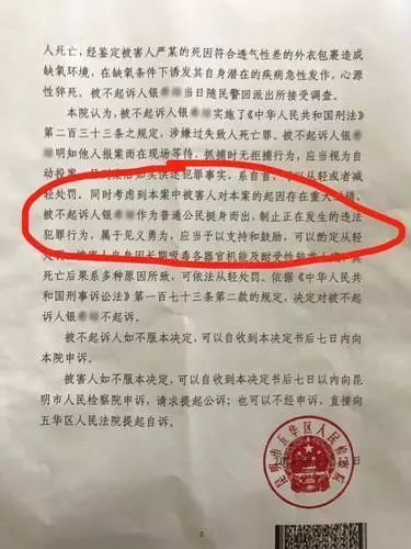 2018年3月12日,五华区检察院对银先生作出不予起诉的决定。也就是说,出于银先生的见义勇为行为和严某的意外死亡,对银先生的刑事责任不予追究。