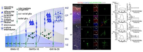 在前额叶皮层中起着尤为关键作用的是众多的神经元细胞,在过去的认识中,我们只知道绝大部分的新生神经元在人类胎儿出生前已经开始分化和迁移,但对这些关键的神经发育事件的具体发生时间却知之甚少。研究人员通过对神经元单细胞转录组数据的系统分析和深度挖掘,首次揭示了在人类大脑前额叶皮层发育过程中兴奋性神经元生成、迁移和成熟的三个关键阶段:(一)8-12周神经干细胞大量增殖阶段;(二)13-16周神经干细胞分化并大量产生新生神经元同时伴随着新生神经元的迁移阶段;(三)19-26周,神经元开始逐渐成熟,表达关键功能蛋白并初步形成有功能的神经网络的阶段。神经元细胞形成具有功能的神经网络的过程是大脑发育的一个非常重要的阶段,王晓群研究组利用电生理等手段对人类围产期26周的前额叶皮层进行了深入的功能研究,发现在前额叶皮层中很多神经元已经具备了正常发放钠钾电流的能力,在深层脑区的神经元更是具备了发放EPSC和IPSC等功能。