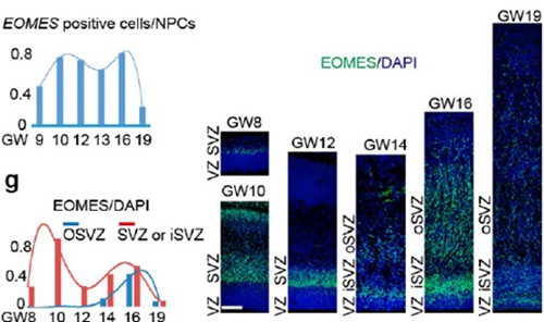 在人类神经干细胞的研究中,虽然近些年来主要研究集中在RG细胞或oRG细胞上,但是中间前体细胞IPC对于神经发生、特别是灵长类动物的神经发生同样起着重要的作用。通过系统的数据分析和多层次的实验验证,研究人员提出IPC的产生具有两个关键爆发期,一个是在胚胎发育10周左右,这些IPC主要由RG大量产生,而另一个峰值则发生在胚胎发育16周左右,这些IPC由oRG大量产生。正是通过IPC的这两个爆发期的形成,数量庞大的神经元才能在短暂的大脑皮层发育时期内快速生成,并形成了结构复杂、功能丰富的前额叶皮层。