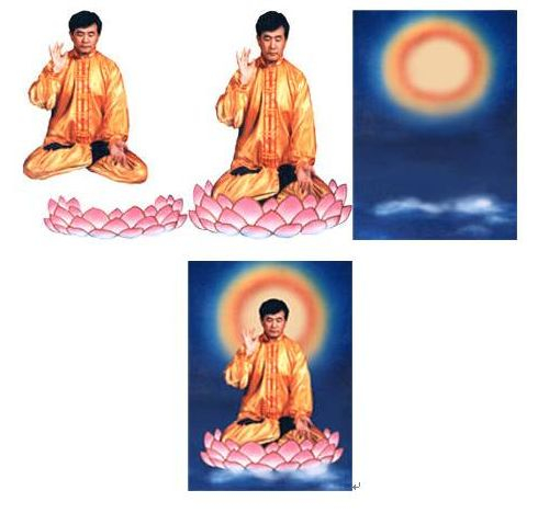 据说,这是李洪志坐在莲花宝座上打坐时,突然佛光普照真身显现而成的。然而,原“法沦功”弟子宋炳辰揭穿了李洪志的秘密。