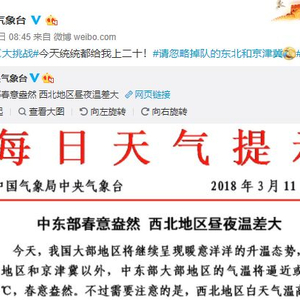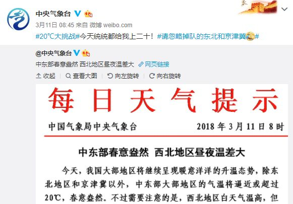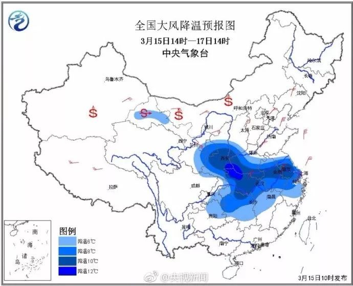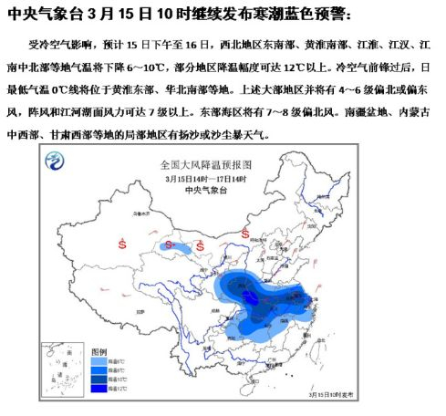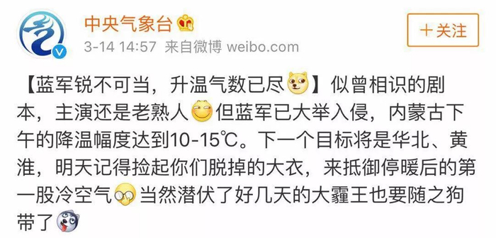 3月14日,@中央气象台 发布微博表示,多地即将迎来降温:蓝军锐不可当,升温气数已尽!