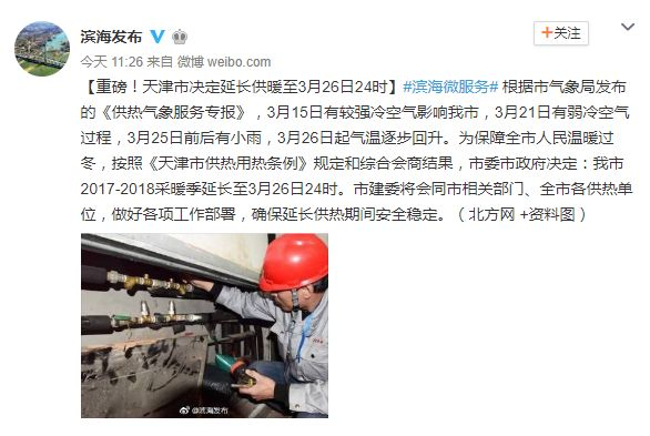 据报道,3月15日有较强冷空气影响天津市,3月21日有弱冷空气过程,3月25日前后有小雨,3月26日起气温逐步回升。市委市政府决定:天津市2017-2018采暖季延长至3月26日24时。