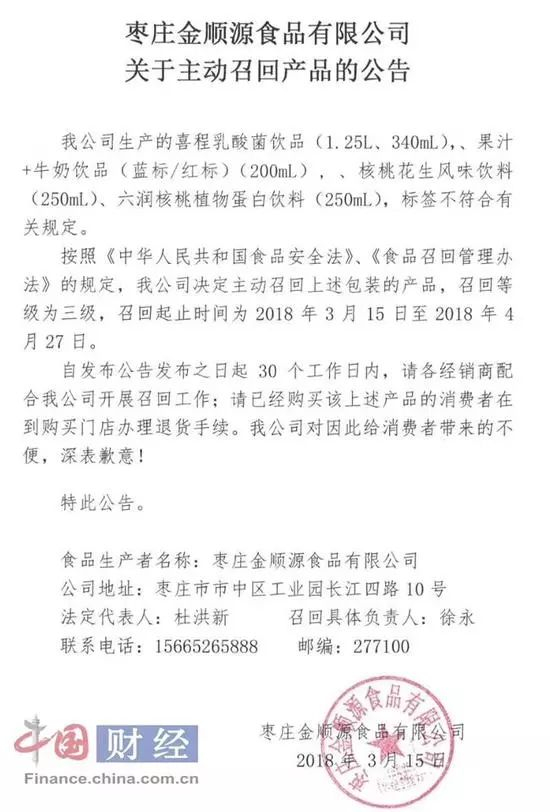 被央视315晚会曝光后,相关企业枣庄金顺源食品有限公司随后发布“关于主动召回产品的公告”。