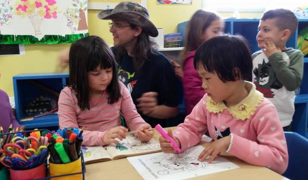 不同国籍的小朋友在幼教老师(少有的男老师)指导下画画。