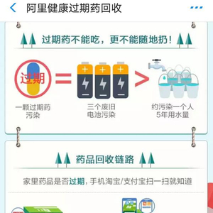根据阿里健康的平台测算,一颗过期药对环境的污染可相当于三个废旧电池,可污染约一个人5年的用水量。
