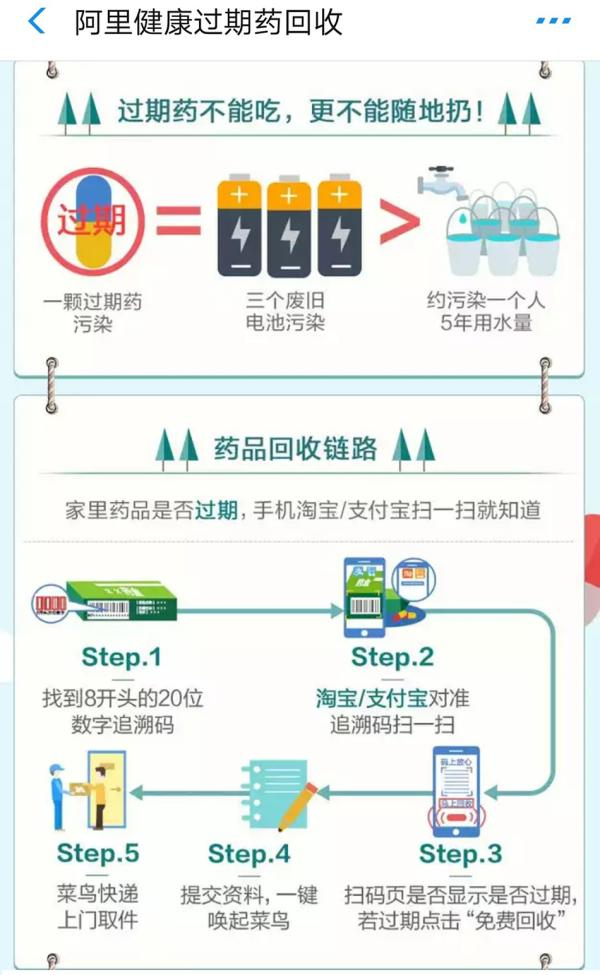 首先,通过手机淘宝、支付宝等APP扫描药盒上以数字“8”开头的20位药品电子监管码,在跳转出的详情页查询药品是否过期,若药品已过期,找到“过期药回收”入口;其次,进行家庭地址、联系方式等资料填写,一键召唤“菜鸟物流”快递员;最后,快递员免费上门取走过期药,完成回收全流程后,用户还可领取鼓励优惠券。