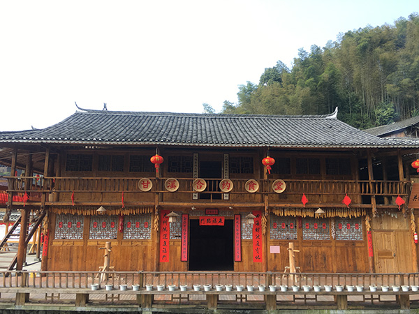 站在寨门口向西望去,村民们的吊脚楼依山而建,一条小溪从山上蜿蜒东下。顺着溪流看过去,一幢两层的木质青瓦房格外引人注意,这是全寨村民引以为豪的地方之一——甘溪“合约食堂”。
