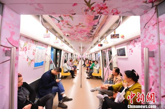 中新网成都3月19日电 (邹立杨)为凸显成都龙泉驿区桃花文化,倡导广大市民绿色出行,营造成都春天气息,第一辆“开往春天的列车”——成都地铁2号线桃花专列于3月19日上午9点正式发车。