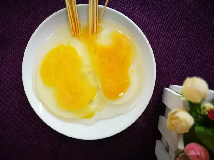 花色盘子中的牙签上挂满了浓稠的蛋黄