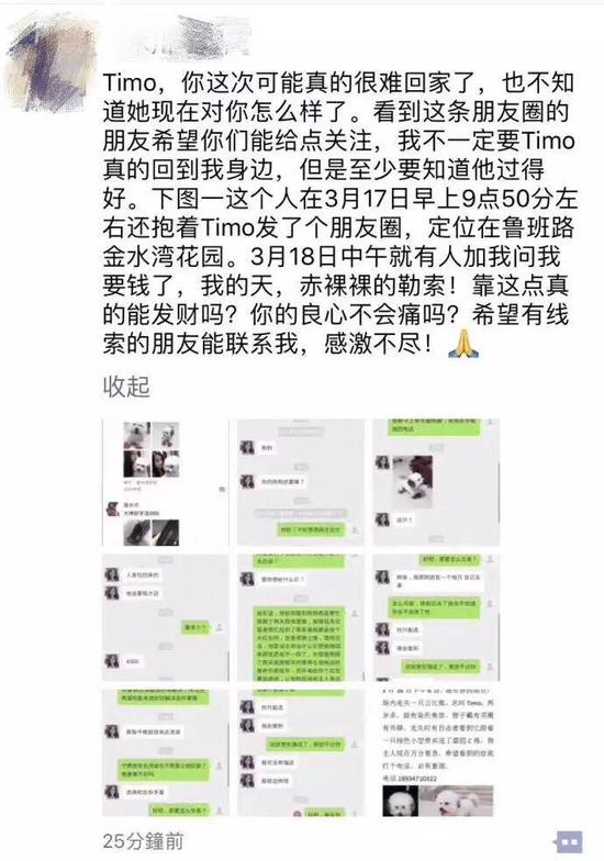 小洋表示,在他提出可以撤回微信微博,发公告声明消除舆论影响后,对方的态度软了下来。“后来对方也没再提要钱的事,就说确定会把Timo”还给我。