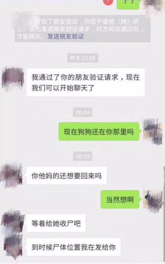 3月18日深夜,对方再次通过了小洋的好友申请。在之后的沟通中,对方接连表示:“等着给她收尸吧”,“到时候尸体位置我再发给你”,“我不想要(钱)了,我想要他死。要你后悔”。