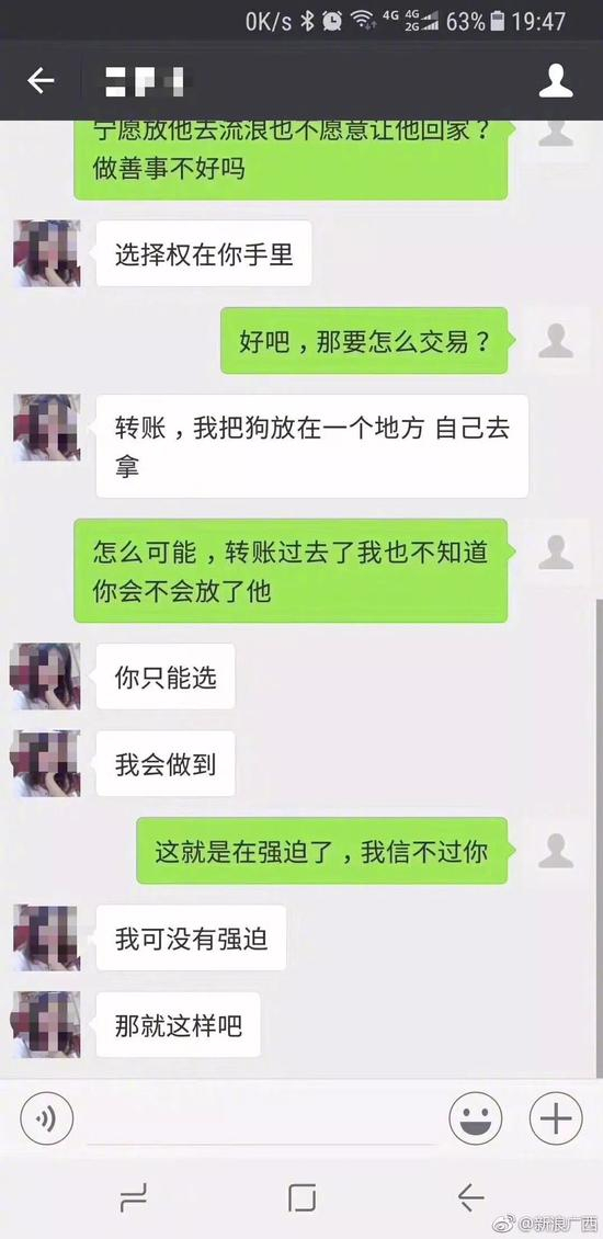 小洋服软后询问交易方式,对方提出“转账,我把狗放在一个地方,自己去拿。”小洋对这种方式表示不信任,对方之后就把他拉黑了。