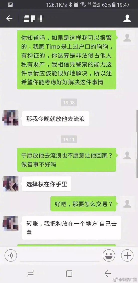 3月18日下午,有人通过微信联系小洋。小洋提供的微信聊天记录显示,对方称狗在她朋友手上,并发来了Timo的照片。同时,对方提出还狗的条件是,小洋给她4500元。