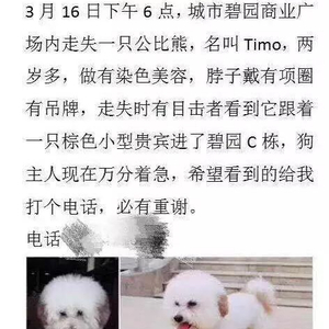 3月16日下午,Timo在理发店附近玩耍时走失。小洋随即在理发店所在的小区张贴《寻狗启示》,并注明狗脖子戴有项圈和吊牌。小洋称,吊牌上有他的联系方式。