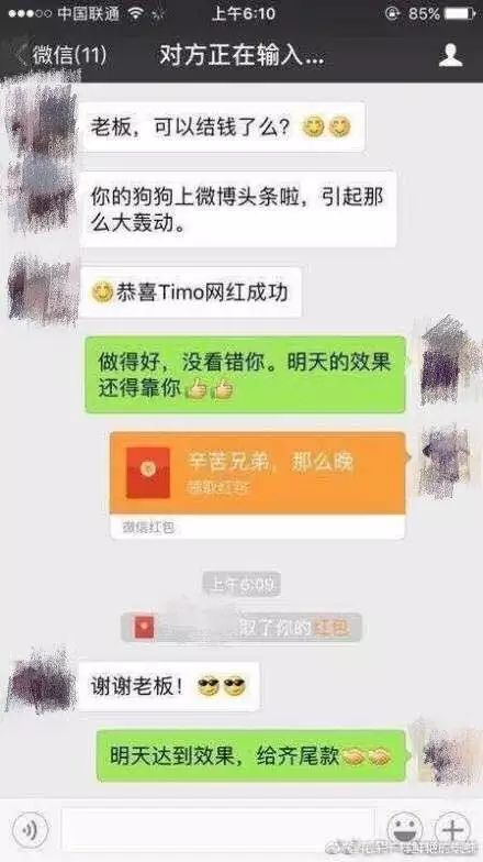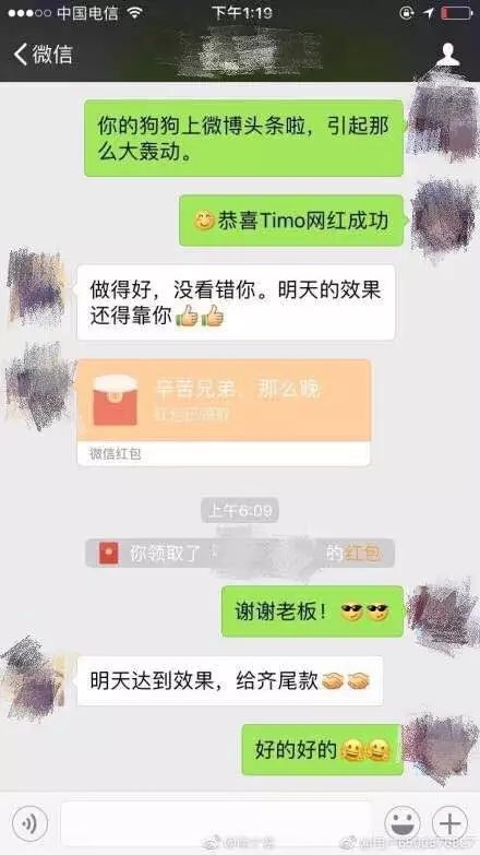 两张截图的内容相同,截图中,对方和小洋以老板和兄弟互称,对方先恭喜Timo上了微博头条,成为网红狗,然后小洋向对方发了一个微信红包,并表示“做得好,没看错你。明天的效果还得靠你。”