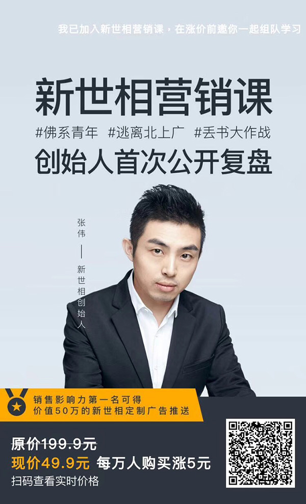 从起初“新世相营销课”的海报可看到,其称“推荐给朋友购买可直接获得40%的现金奖励,获得推荐现金奖励多的学员,按照影响力实时排名。榜单第一名奖励价值50万的新世相定制广告推送;第二名到第十名最高一万元奖金。