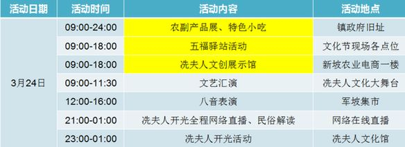 今年冼夫人文化节期间,新坡镇冼夫人纪念馆将开展重现当年冼夫人沙场点兵场景的装军巡游、花车巡游以及民间祭祀等民俗活动,还原民俗本味。此外,龙华区还将在文化节各点位区域搭建五福驿站。驿站取材冼夫人五福元素,即平安福(芋头)、长寿福(薤葱)、子孙福(小番薯)、吉祥福(金桔)、利是福(桑叶),每个五福驿站设计融入冼夫人卡通形象,游客凭票领取5支福箭,投入壶中即可获得一个五福书签。