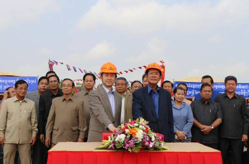 2月9日,由中国优惠贷款援助、上海建工集团承建的斯登特朗-格罗奇马湄公河大桥正式开工,这是中国在柬埔寨建设的第8座大型桥梁。图为柬埔寨首相洪森(前右)出席开工仪式。(毛鹏飞 摄)