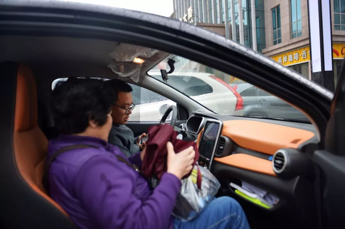 (因为自己车限号,一位市民使用共享汽车送家人回家。)