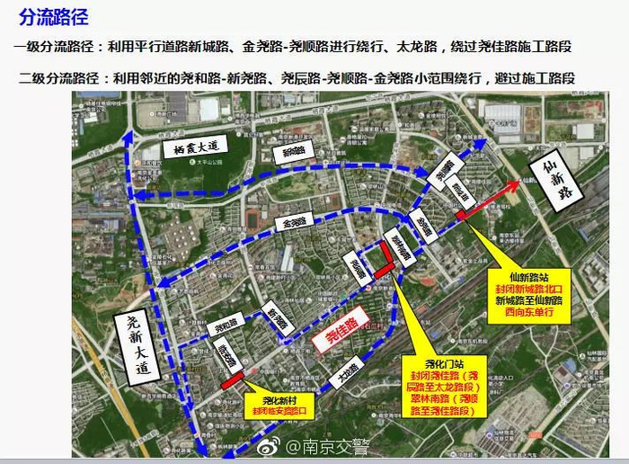 因尧化门区域站点施工需要,尧佳路与邻安路路口、尧佳路、翠林南路全封闭围挡施工;尧佳路实行由西向东单行;尧佳路与新城路路口北口封闭施工。