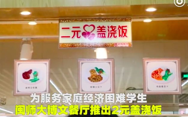 据闽南师范大学官方微信平台介绍,为服务家庭经济困难学生,闽南师大后勤管理处从2017年9月21日开始每天中、晚餐在博文餐厅推出“2元盖浇饭”窗口。