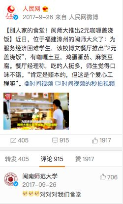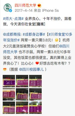 学校官方微博称,“业界良心,十年不涨价,跟着我,今天请你吃食堂[饞嘴]”