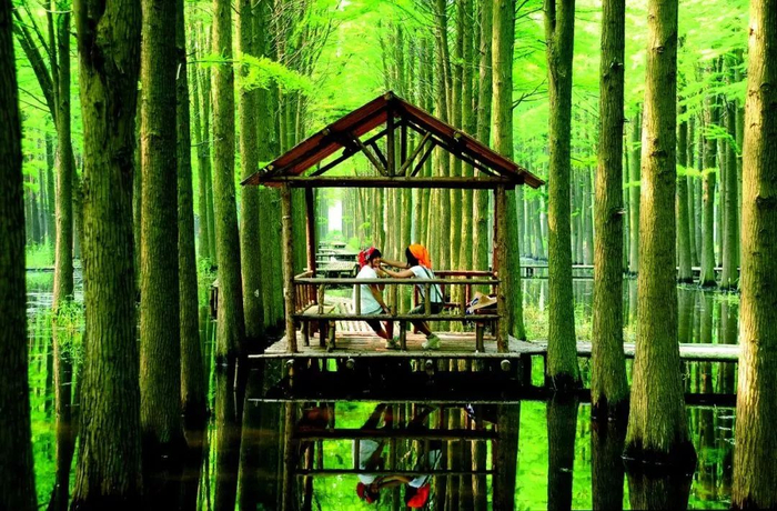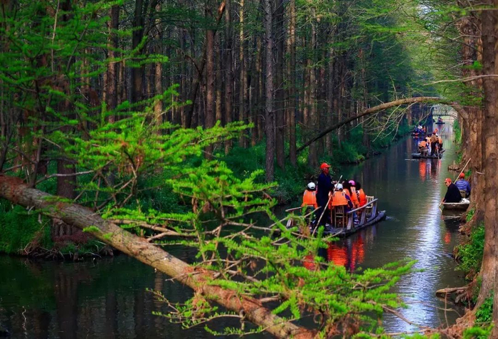 李中水上森林——这里是水杉的王国,这里是鸟类的天堂。栽种了10万余株水杉、池杉等品种树木已长成高大茂密、生机盎然。林中鸟最多时有6万多只,正常有3万只左右,鸟窝随处可见。漫步其中,体会大自然的生态之美,乘坐竹筏欣赏鸟类穿梭林间的悠闲之美。