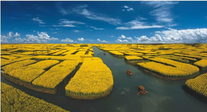 每年三四月期间,千垛景区四面环水的“垛田”上长满了金黄色的油菜花。一幅“油菜花开金满地”的壮阔美景,吸引了众多前来观光的游客。“河有万湾多碧水,田无一垛不黄花”正是兴化垛田菜花的真实写照。