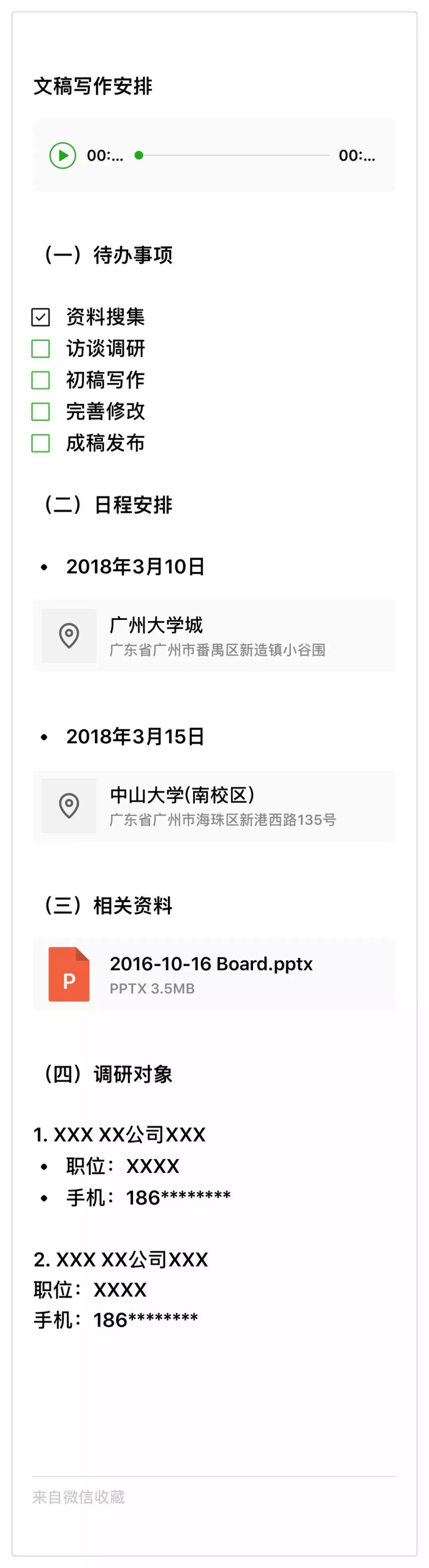 现在好啦!我们可以在微信笔记里写好待办事项、相关工作安排,并插入对应的文件。对方打开、阅读、下载,并开展工作,一气呵成~