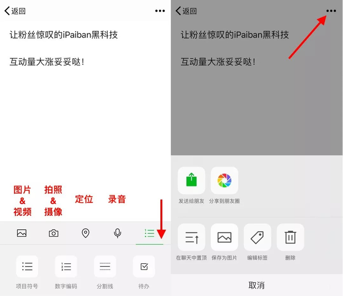 需要注意的是:在 iOS版本的微信里,没有字体加粗功能,但是多了拍摄功能。