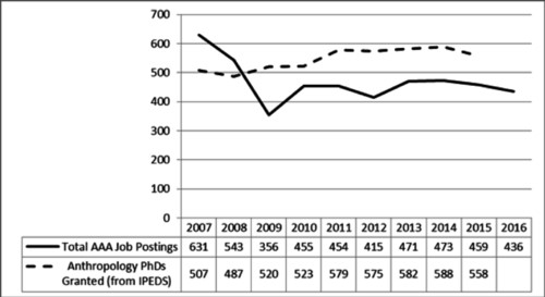 美国人类学协会统计的2007-2016年教职与博士毕业生数据