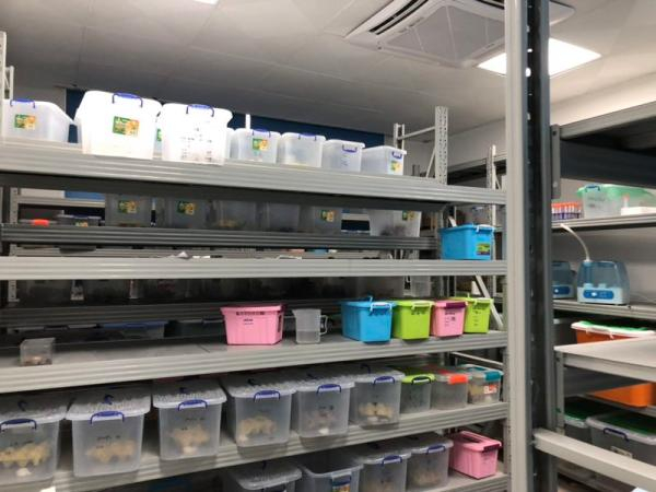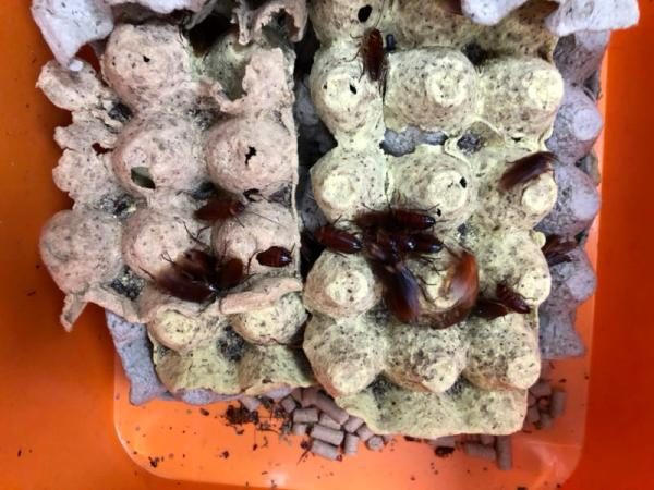 随后,李胜就专门开辟了一间蟑螂屋。二十几平方米的蟑螂屋内,放置了许多铁架子,架子上一层一层撂了很多塑料收纳箱,每个箱子里放着一个菜市场随处可见的纸浆鸡蛋托盘。就在这样的收纳箱里,培养着数万只品种不同、大小不一的蟑螂,鸡蛋托盘的一个个凹陷处成了蟑螂平日喜欢躲藏的地方。