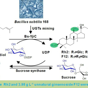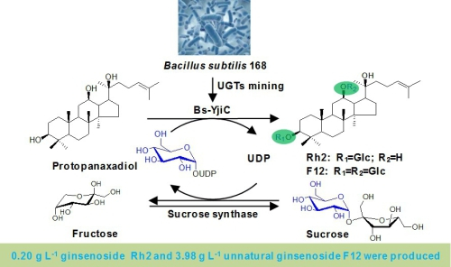 在前期已构建高产原人参二醇酵母细胞工厂的基础之上,针对酵母细胞合成人参皂苷受糖基转移酶催化效率低以及人参皂苷细胞毒性影响等问题,中国科学院天津工业生物技术研究所研究员孙媛霞带领的功能糖与天然活性物质研究团队,与天津工生所研究员张学礼带领的微生物代谢工程研究团队合作,从枯草芽孢杆菌筛选获得糖基转移酶Bs-YjiC并进行表达,该酶能高效催化原人参二醇型人参皂苷的C3-OH和C12-OH糖基化,从而合成稀有人参皂苷Rh2、F2以及多种非天然存在的人参皂苷;进一步对非天然人参皂苷F12(3- and 12-O-β-D-glucopyranosyl-20(S)- protopanaxadiol)的抗癌活性进行表征,发现其具有显著抑制结肠癌、肺癌、肝癌和胃癌细胞增殖的效果,且F12细胞水平的抗癌活性全面优于稀有人参皂苷Rg3。此外,酵母工程菌合成人参皂苷受其细胞毒性影响会导致人参皂苷产量较低,虽然体外糖基化反应可以有效解决人参皂苷的毒性问题,但是体外反应需要价格昂贵且不稳定的NDP-糖基作为糖基供体。该研究构建了糖基转移酶和蔗糖合成酶体外偶联反应体系,有效地实现了体外反应中昂贵的UDP-葡萄糖的再生循环,通过对偶联反应条件优化以及分批次补充原人参二醇底物,可合成0.20 g L-1人参皂苷Rh2 和3.98 g L-1非天然人参皂苷F12。该研究结果丰富了人参皂苷的种类,并为人参皂苷的高效合成提供了新的解决途径。