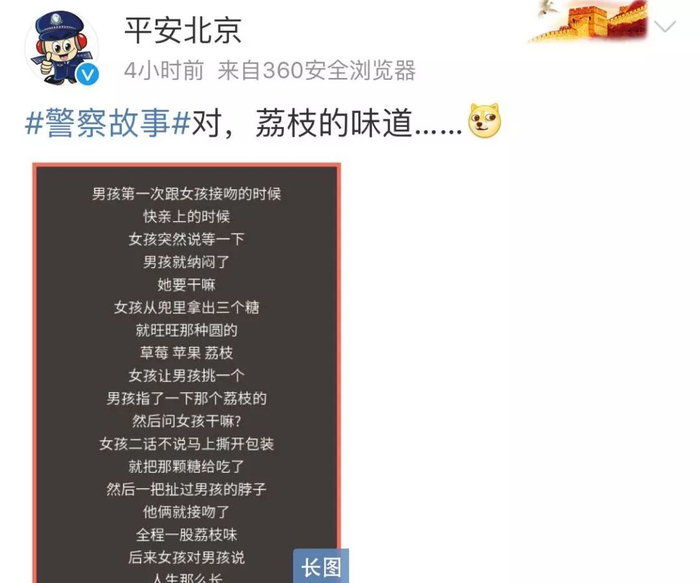 昨天,“荔枝味的吻”火了,还惊动了很多公安部门的官微。