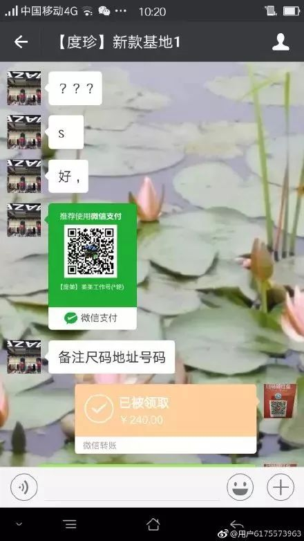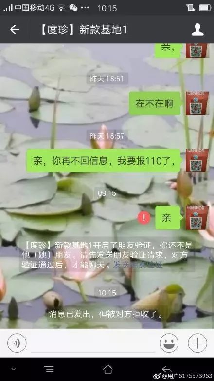 图片显示,微信名为“【度珍】新款基地1”疑似在收到他人钱物后拉黑了别人。