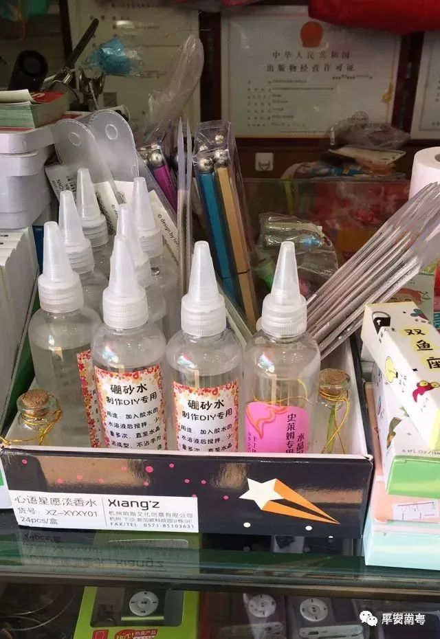 在另一家文具店,记者看到其出售的硼砂就装在一个透明的小塑料盒中,没有任何标识和说明,2元一盒。硼砂水则有注明用途,并有 “不可食用”“请勿误食”等字样,但是也没有生产厂家、生产日期等。文具店老板告诉记者,很多小学生都喜欢购买原材料回去自己动手制作。但是当记者询问有没危害时,老板表示自己也不清楚。