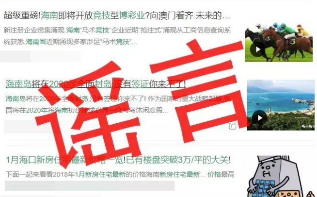2017年12月以来,海南省网信办、住建厅、公安、工商等部门持续加大在楼市这块的辟谣动作,重点打击涉房地产网上信息传播违法违规行为。