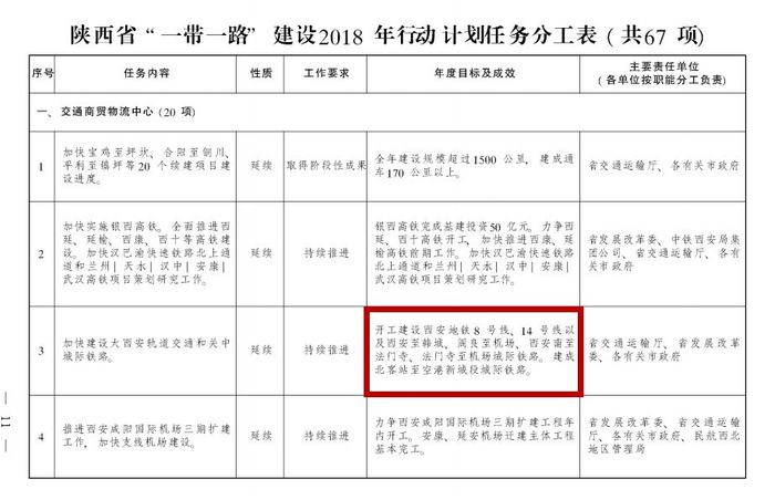 3月20日,陕西省政府发布了《陕西省“一带一路”建设2018年行动计划》,在这份计划中明确提出了在今年开工建设西安地铁8号线、14号线。