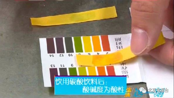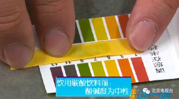 记者准备了一瓶碳酸饮料和一套PH试纸,在喝碳酸饮料之前和之后分别测量口腔内的酸碱度。