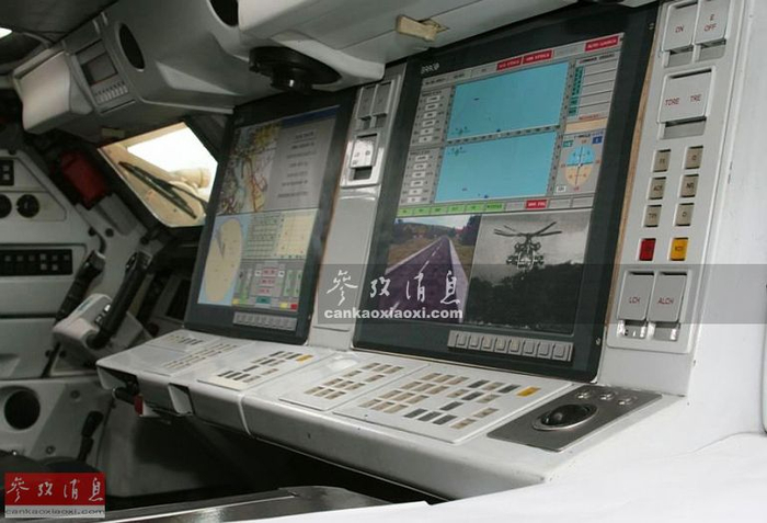图为“铠甲-S1”防空车内舱特写,内侧屏幕为雷达操纵显控台,外侧为光电传感器显控台。