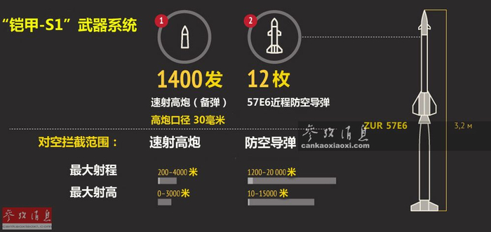 “铠甲-S1”的武器系统包括用于拦截近距离目标的2门2A38M型30毫米速射高炮,射速每分5000发,弹药基数1400发,可使用杀伤破片弹、穿甲弹和高爆燃烧弹等3种型号的炮弹,最大射程4千米,最大射高3千米。此外还搭载有用于拦截远程目标的12枚57E6近程防空导弹,最大射程20千米,最大射高15千米,可拦截以3马赫高速接近的高空或低空目标。