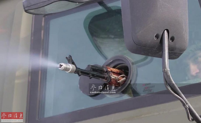 图中可见“铠甲-S1”车队的头车,副驾驶已手持AK-74步枪通过射击孔警戒。