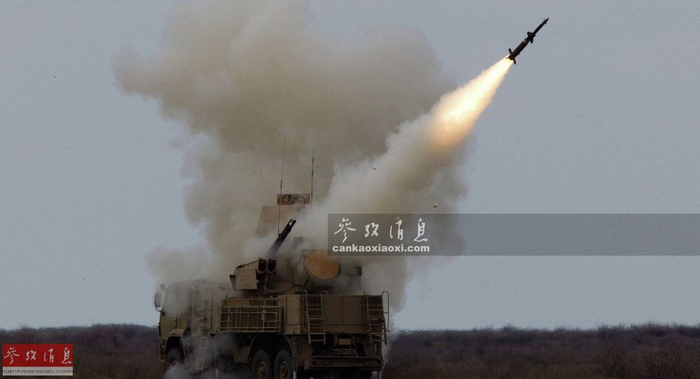 图为“铠甲-S1”发射57E6近程防空导弹摧毁目标动态图。