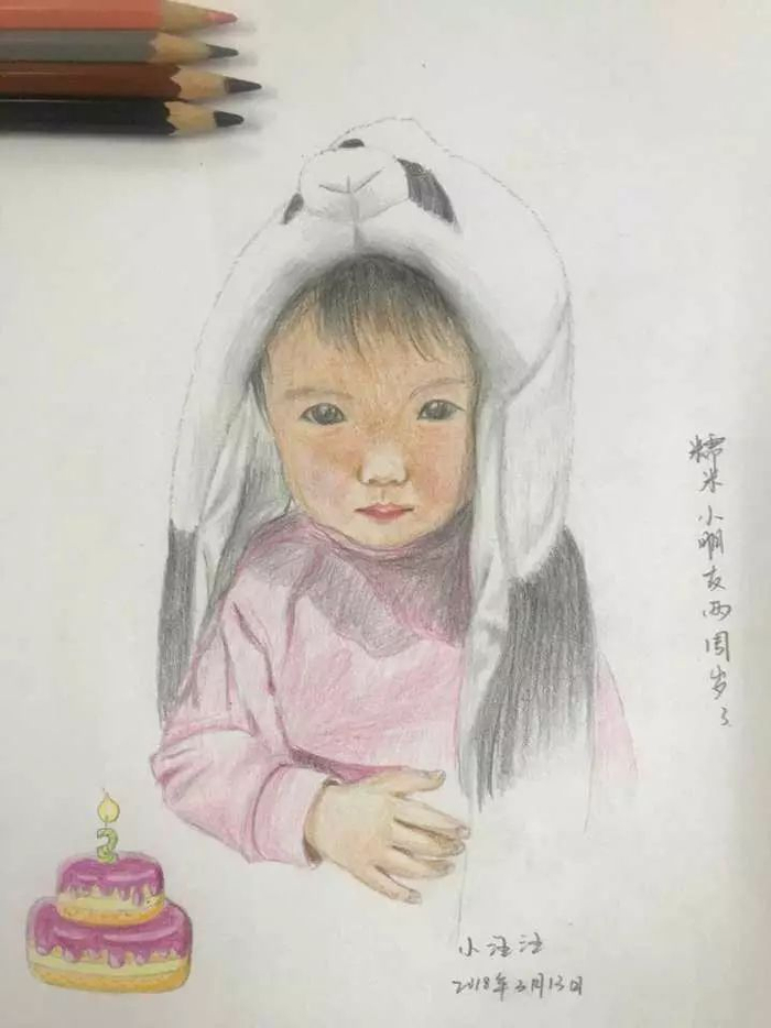 到女儿一周岁的时候她又画了一张,“之后基本上每个月都会画一张”。3月13号,女儿两周岁生日时,汪艇又记录下了带着萌萌熊猫帽子的小糯米。每张画都是汪艇细心挑选的、对女儿有意义的定格,对着照片画下来,这样一幅画在A4纸上的画,基本上要花2个多小时。