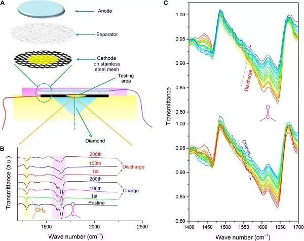 同时,团队研究人员创新性使用静电势计算方法结合原位红外、拉曼和紫外可见光谱等实验手段,研究推演了有机醌类材料在电池反过程中的活性位点以及结构变化,阐明了锌与柱[4]醌的结合发生在碗状柱[4]醌分子上方的两个羰基和底部的四个羰基上,拓展了电化学理论与实验结合新方法。该团队进一步构建了有机水系锌全电池,基于醌正极材料和理论上使用的最低锌负极质量进行计算,能够提供220瓦时每公斤的能量密度,远超目前使用的水系铅酸电池,也与目前商化化的锂离子电池相当。