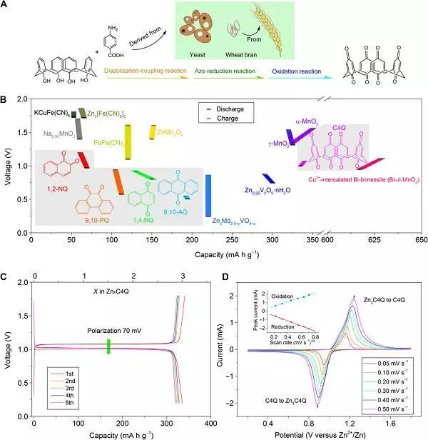 南开大学陈军院士团队多年来一直致力于有机醌类电极材料的设计、制备和应用,近日,他们通过合理结构设计将醌类化合物应用于可充水系锌电池。通过对比研究系列醌类化合物,团队发现,具有4个对苯醌结构单元和8个羰基的杯醌类正极材料,能够获得335毫安时每克的比容量,充放电平台电压差低至70mV,能量效率高达93 %,容量远超目前报道的大部分正极材料,并且循环1000次之后,容量保持率为87%,循环稳定性可与无机电极材料媲美。