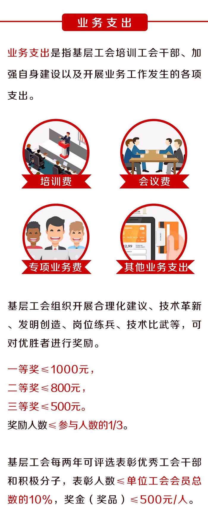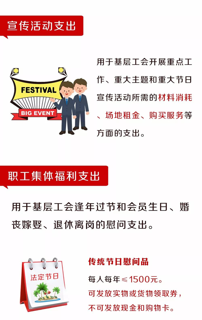 明确基层工会组织的文体活动支出和职工集体福利等活动支出办法,明确基层工会逢年过节可以向全体会员发放节日慰问品,每位会员年度慰问标准不超过1500元,并首次将婚丧嫁娶、退休等纳入慰问范围。