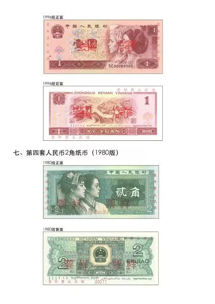 (六)第四套人民币1元纸币。其主色调为深红,正面图案为瑶族、侗族人物头像,背面图案为长城。