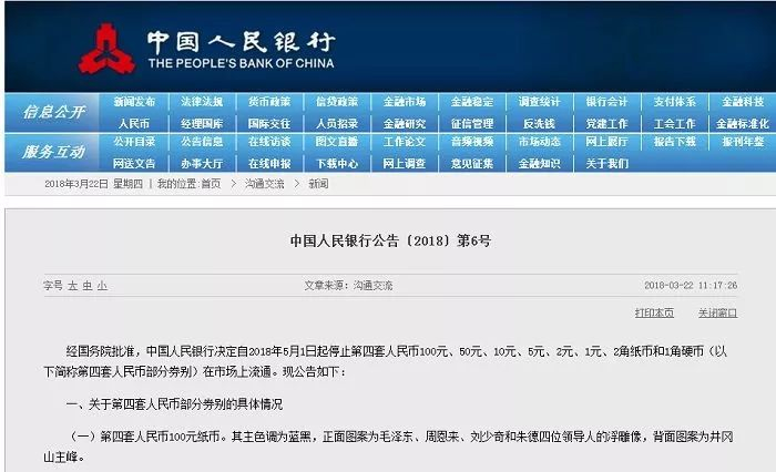 据中国人民银行官网消息,经国务院批准,中国人民银行决定,自2018年5月1日起,停止第四套人民币100元、50元、10元、5元、2元、1元、2角纸币和1角硬币在市场上流通。