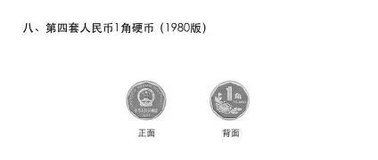(八)第四套人民币1角硬币。其材质为铝镁合金,正面图案为国徽、国名、汉语拼音国名、年号,背面图案为菊花、面额。
